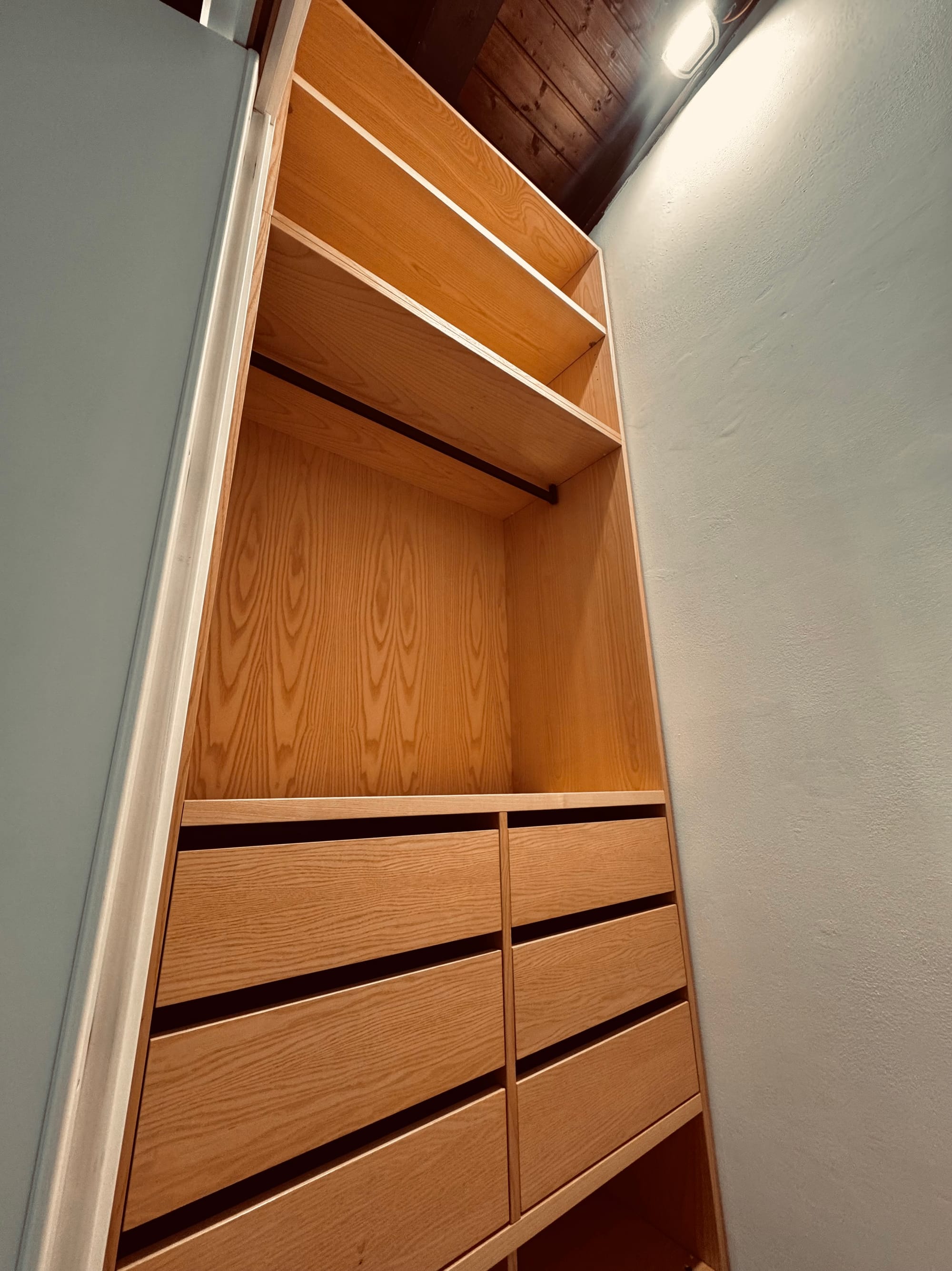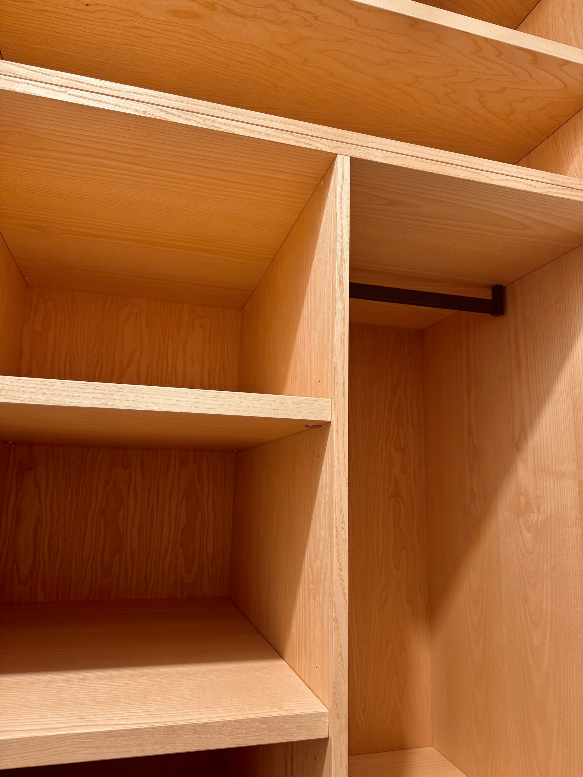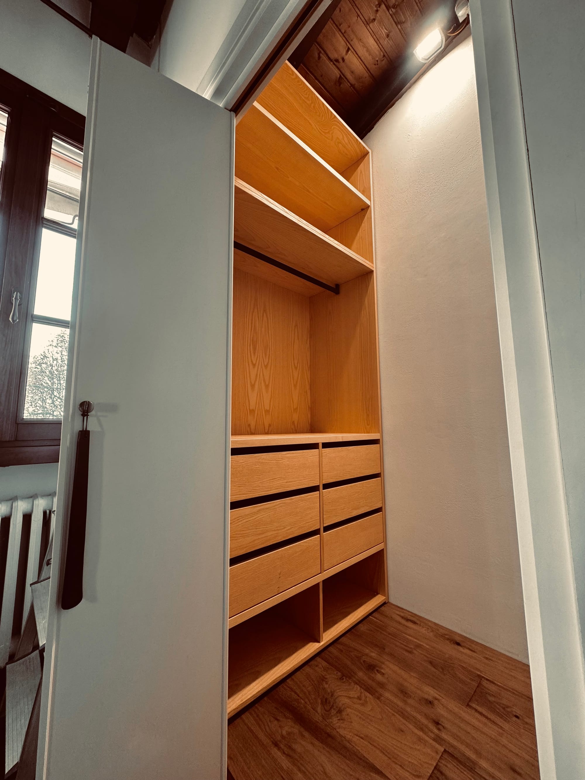 Il progetto prende forma seguendo le proporzioni del vano: una cabina che si compone in due armadi affacciati uno all’altro, come se si guardassero negli occhi. La struttura, in listellare placcato Frassino, sale dal pavimento al soffitto con spessori studiati – 19 mm per fianchi e ante, 25 mm per i ripiani – così da dare un senso di solidità senza appesantire lo spazio. Ogni linea è pulita, ogni giunzione è pensata per scomparire, lasciando che sia solo il disegno del legno a parlare.