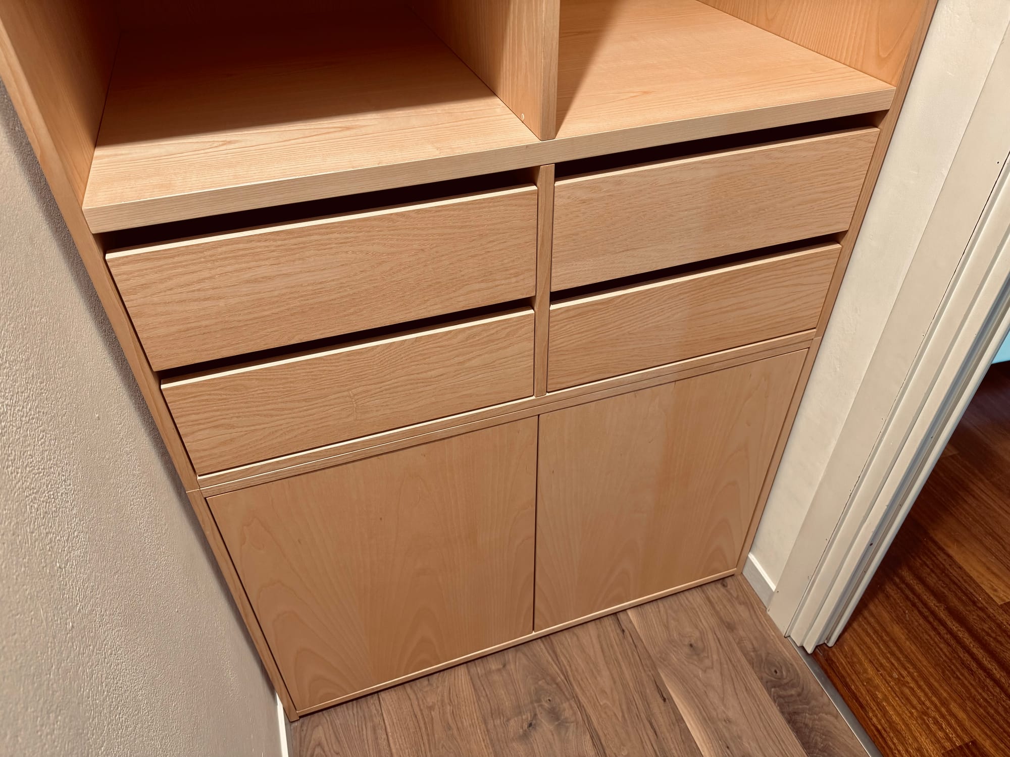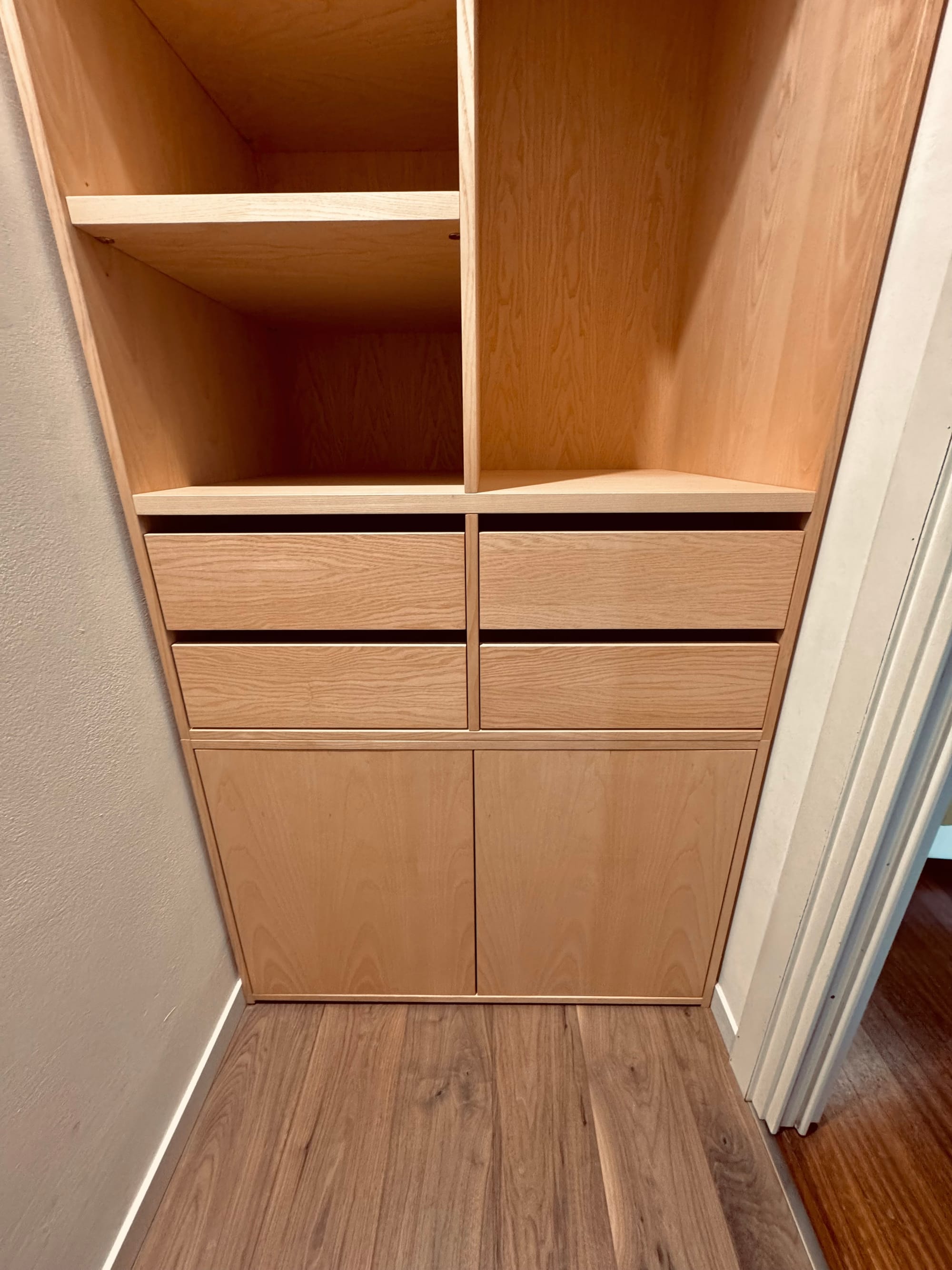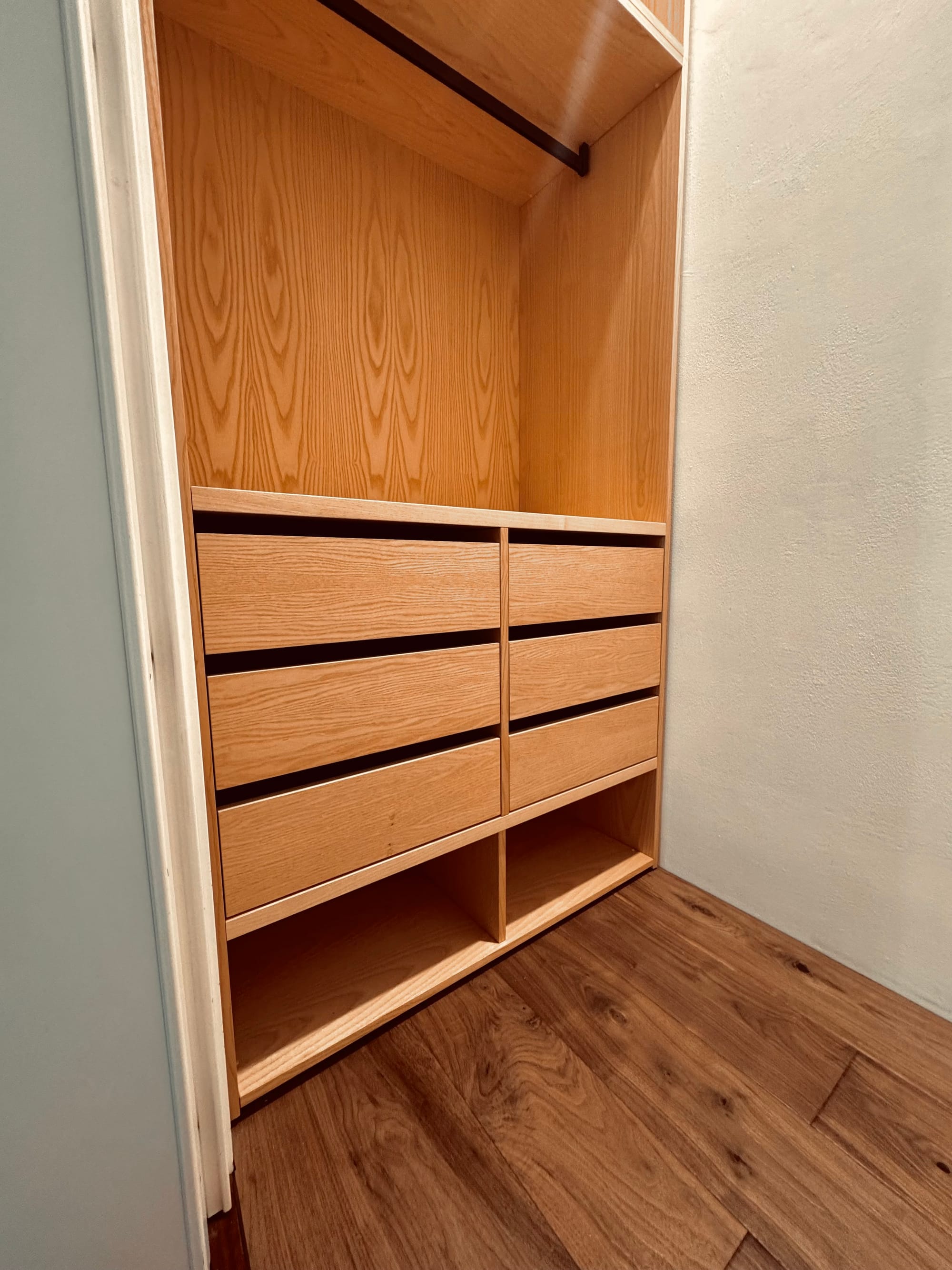 Il progetto prende forma seguendo le proporzioni del vano: una cabina che si compone in due armadi affacciati uno all’altro, come se si guardassero negli occhi. La struttura, in listellare placcato Frassino, sale dal pavimento al soffitto con spessori studiati – 19 mm per fianchi e ante, 25 mm per i ripiani – così da dare un senso di solidità senza appesantire lo spazio. Ogni linea è pulita, ogni giunzione è pensata per scomparire, lasciando che sia solo il disegno del legno a parlare.