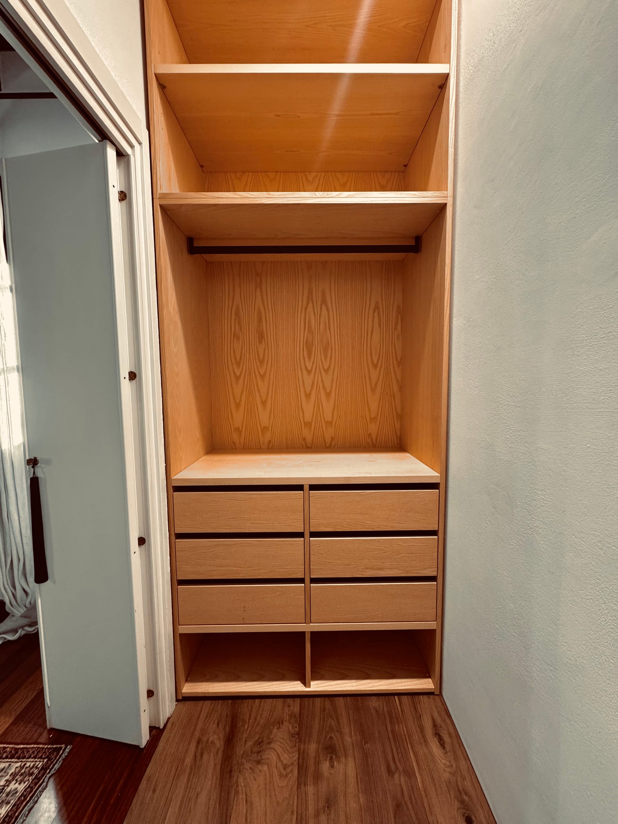 A completare la scena, è stato posato il parquet che si vede nelle immagini: la tonalità del pavimento dialoga con la cabina, unendo stanza e armadio in un unico paesaggio domestico. Camminando scalzi su queste doghe, si ha la sensazione che la cabina non sia un semplice arredo, ma una piccola stanza nella stanza, pronta a custodire abiti e abitudini quotidiane.