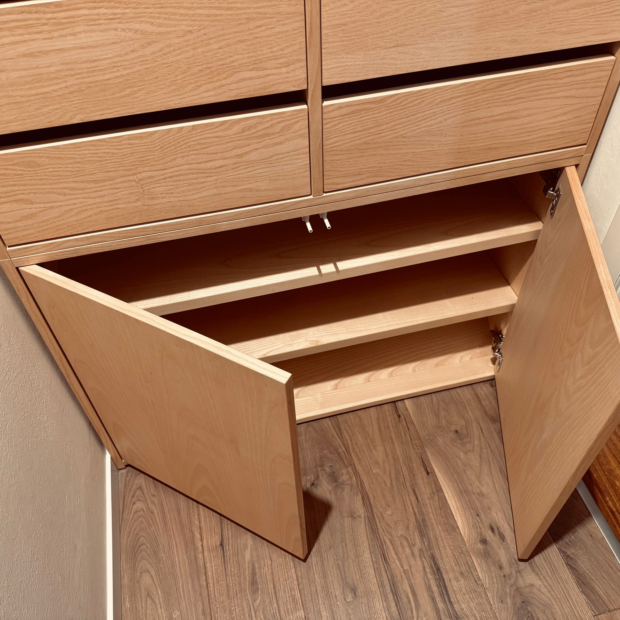 La vera anima artigianale, però, è nascosta all’interno: tutti i cassetti sono in legno massello di Toulipier, con giunzioni a coda di rondine che parlano la lingua della falegnameria tradizionale. L’olio colorato in tonalità scura, steso con pazienza, ne sottolinea le venature e crea un dialogo cromatico più intenso rispetto al Frassino chiaro della struttura. È un contrasto sottile, percepibile soltanto quando si apre il cassetto e si scopre questo interno più caldo e profondo.