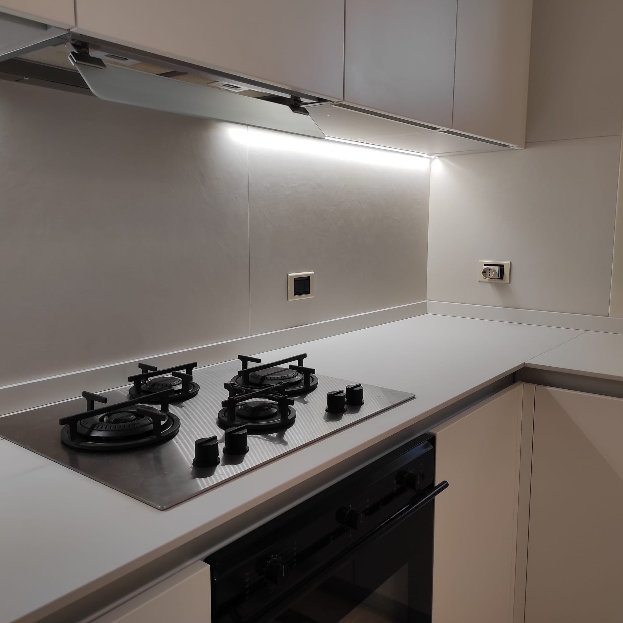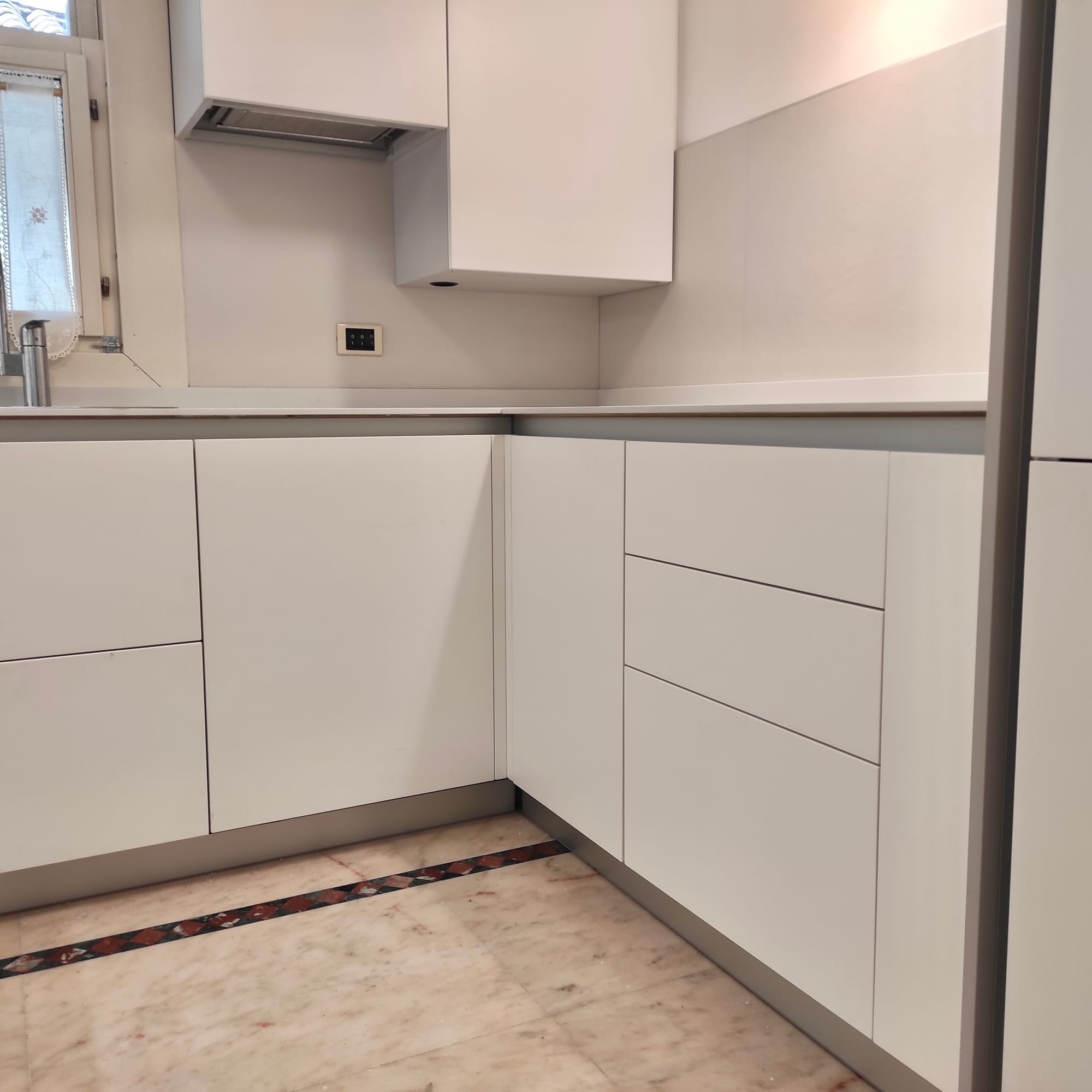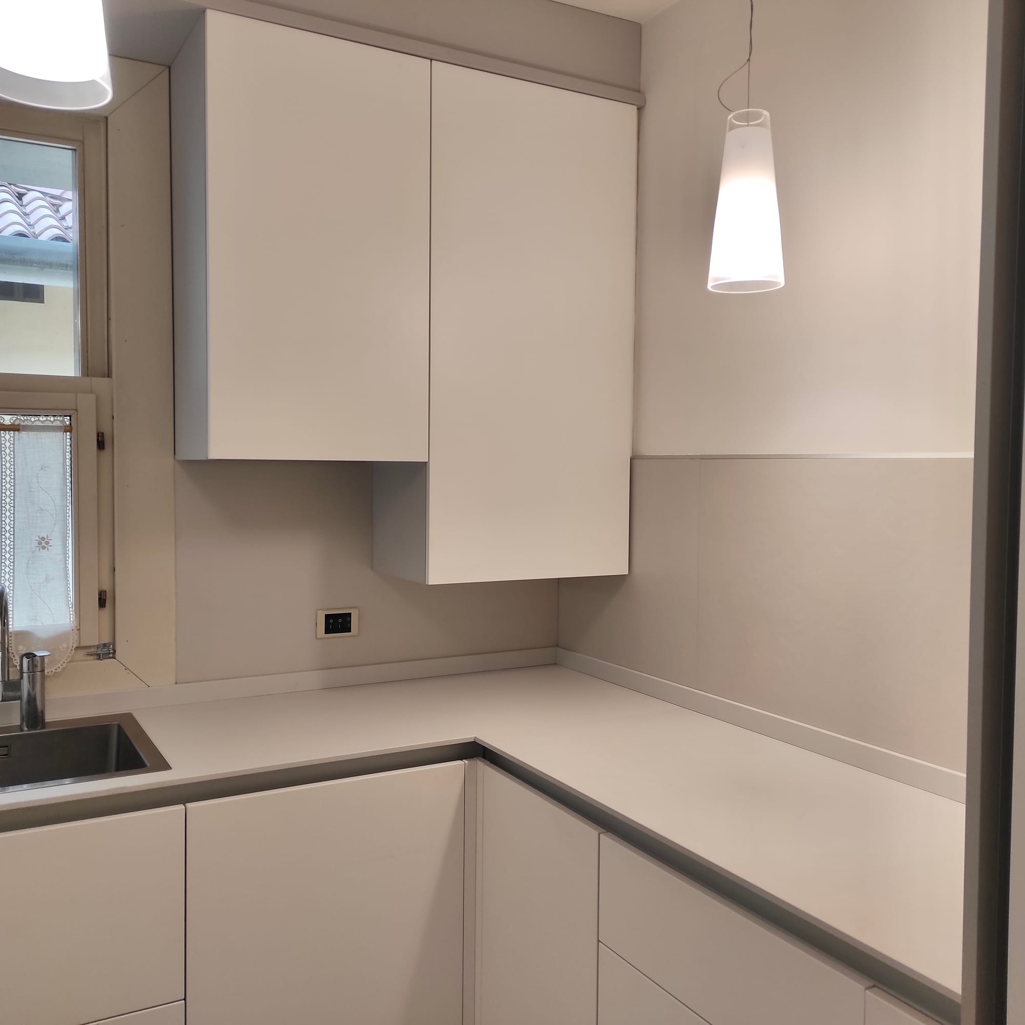 Una sezione dei pensili è stata progettata per nascondere la caldaia a gas: l’anta si apre per l’accesso manutenzione, mantenendo il fronte uniforme con il resto della composizione. Il piano di lavoro da 12 mm in Lapitec è stato posato con cura utilizzanto sigillature impermeabili.