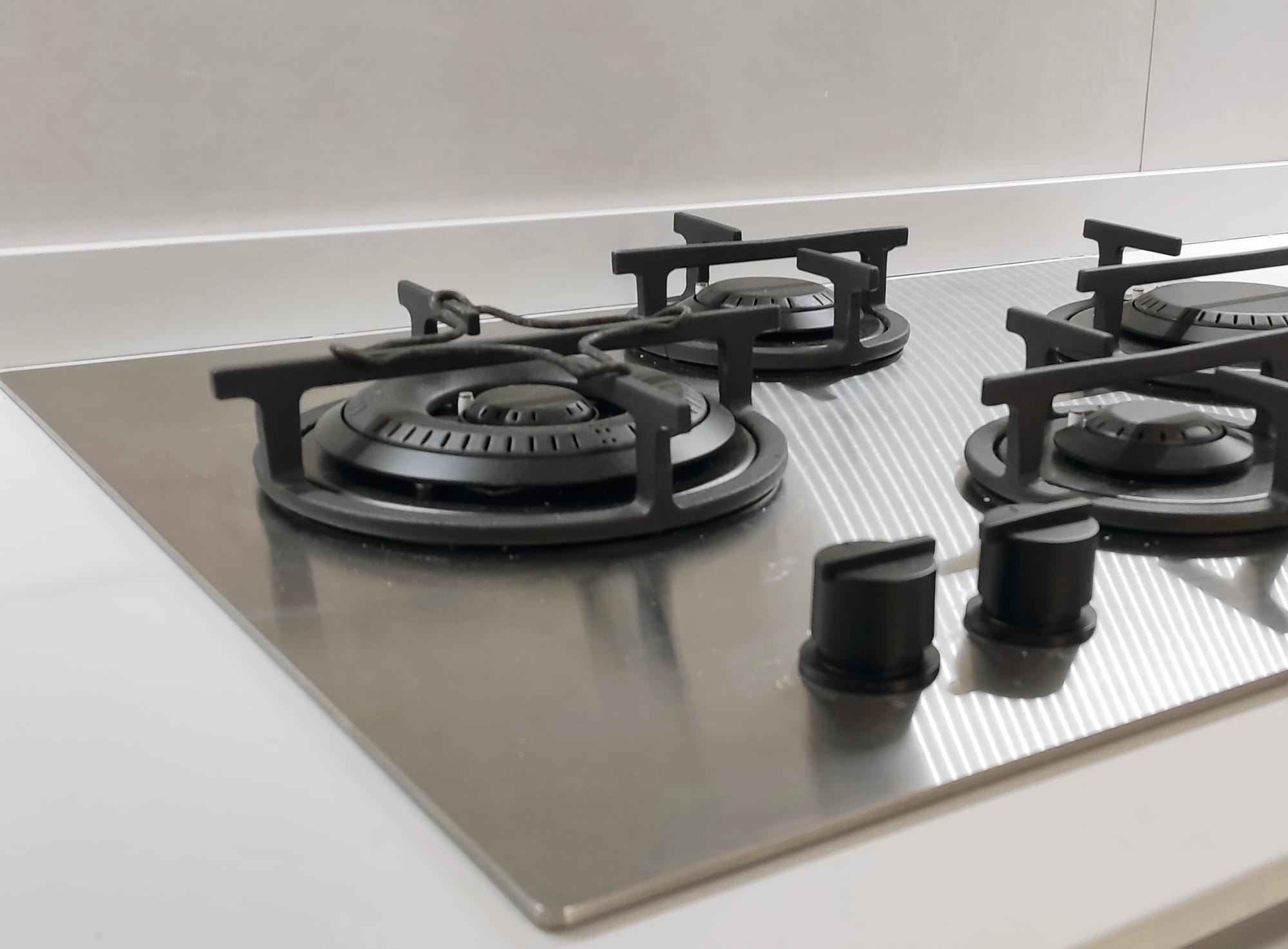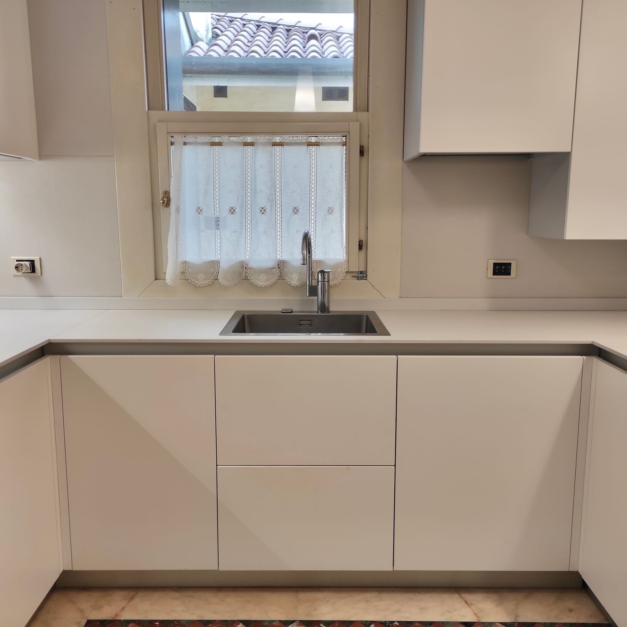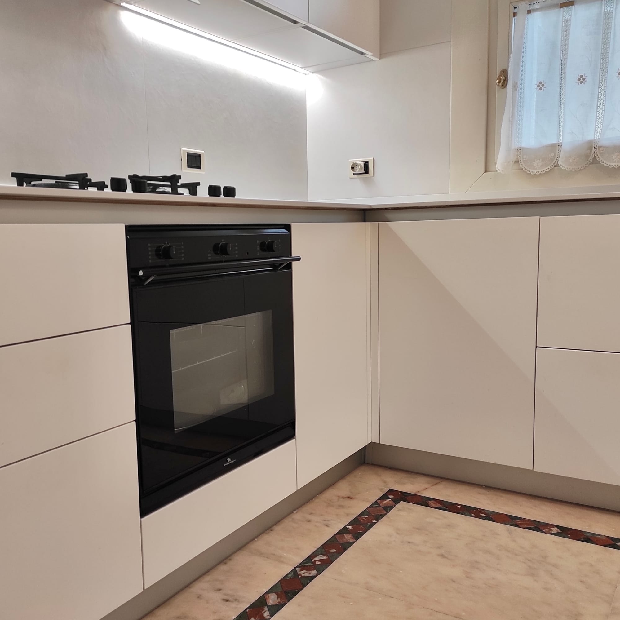 Una sezione dei pensili è stata progettata per nascondere la caldaia a gas: l’anta si apre per l’accesso manutenzione, mantenendo il fronte uniforme con il resto della composizione. Il piano di lavoro da 12 mm in Lapitec è stato posato con cura utilizzanto sigillature impermeabili.