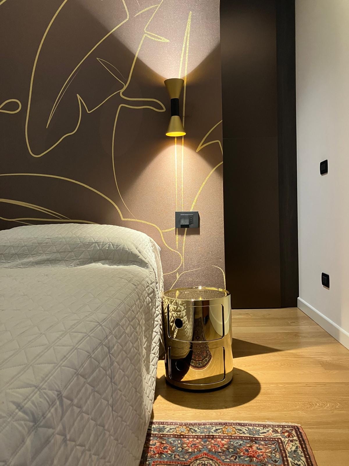 La Quinta è stata posizionata tra il letto e l’area del guardaroba aperto per creare due microambienti distintivi senza sacrificare l’apertura complessiva della stanza, e rivestita con carta da parati scelta e realizzata su misura per il cliente, per aggiungere un tocco decorativo che crea un punto focale visivo e conferisce uno stile raffinato all’ambiente grazie ai motivi eleganti e sofisticati selezionati.