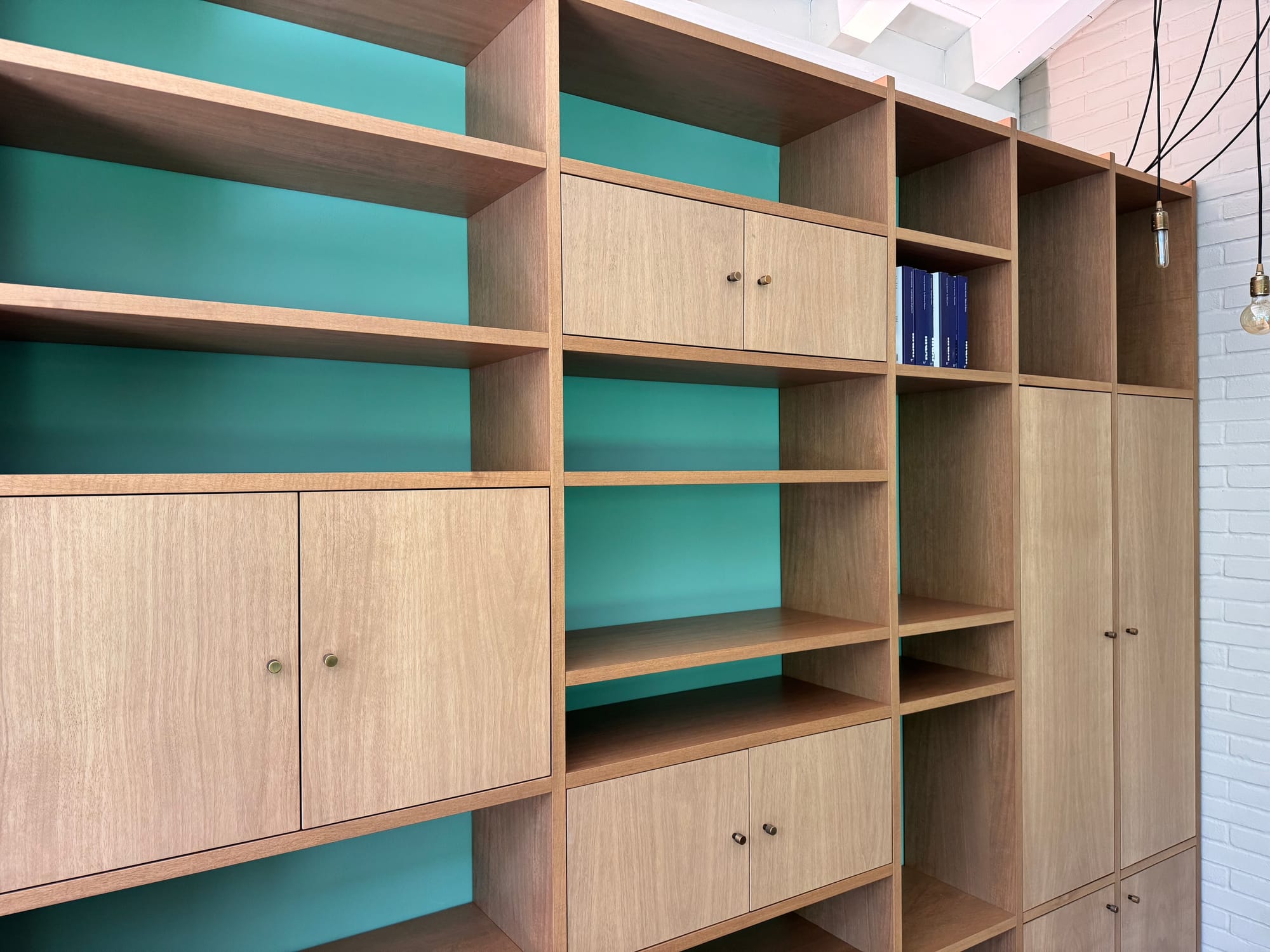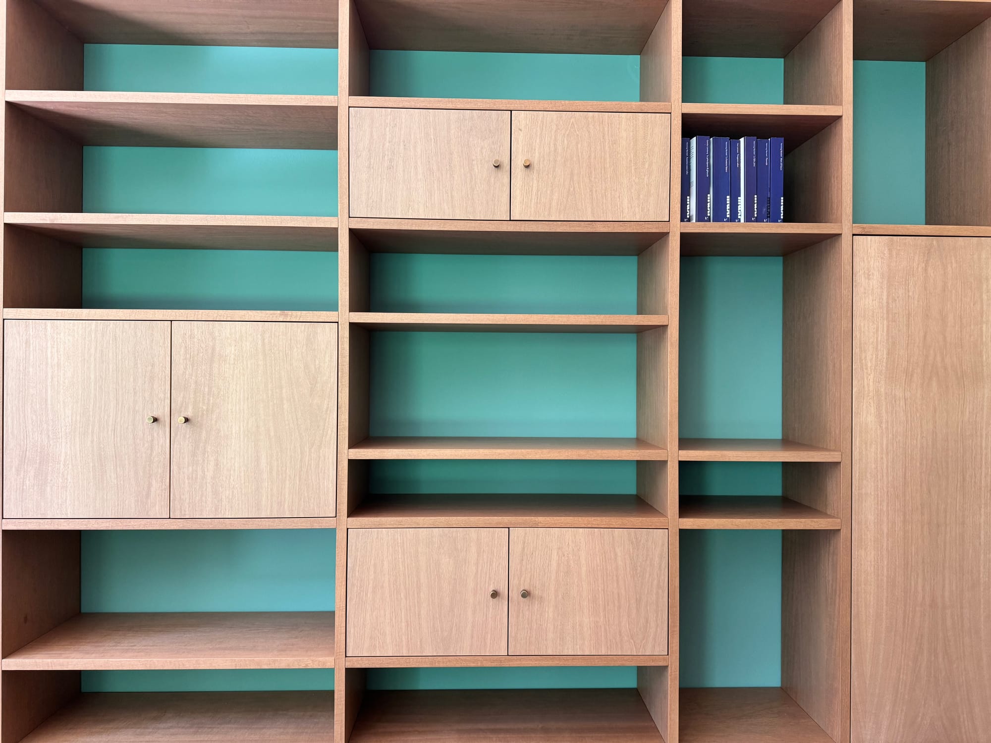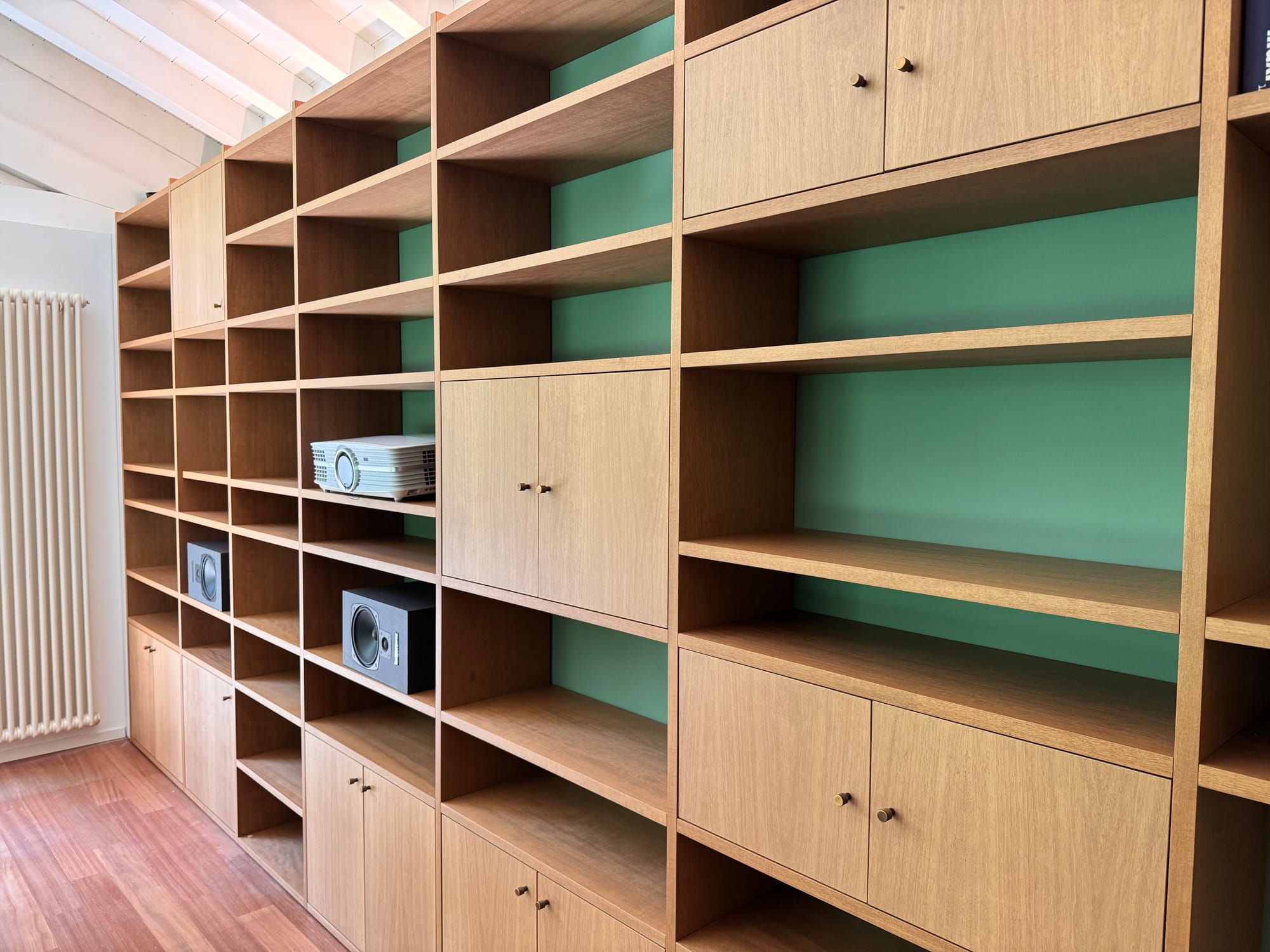 Guardandola ora, la libreria è ancora in parte vuota, pronta a essere riempita di storie, musica, ricordi. I moduli chiusi custodiranno ciò che è più personale, mentre le nicchie aperte diventeranno piccole scenografie di libri, fotografie, oggetti di viaggio, magari una chitarra appoggiata lì vicino, pronta a essere suonata. In questo equilibrio tra pieno e vuoto, tra legno e colore, la parete si trasforma in un paesaggio domestico in continuo cambiamento, costruito su misura non solo per lo spazio, ma anche per il modo unico in cui il suo proprietario abita la propria casa.