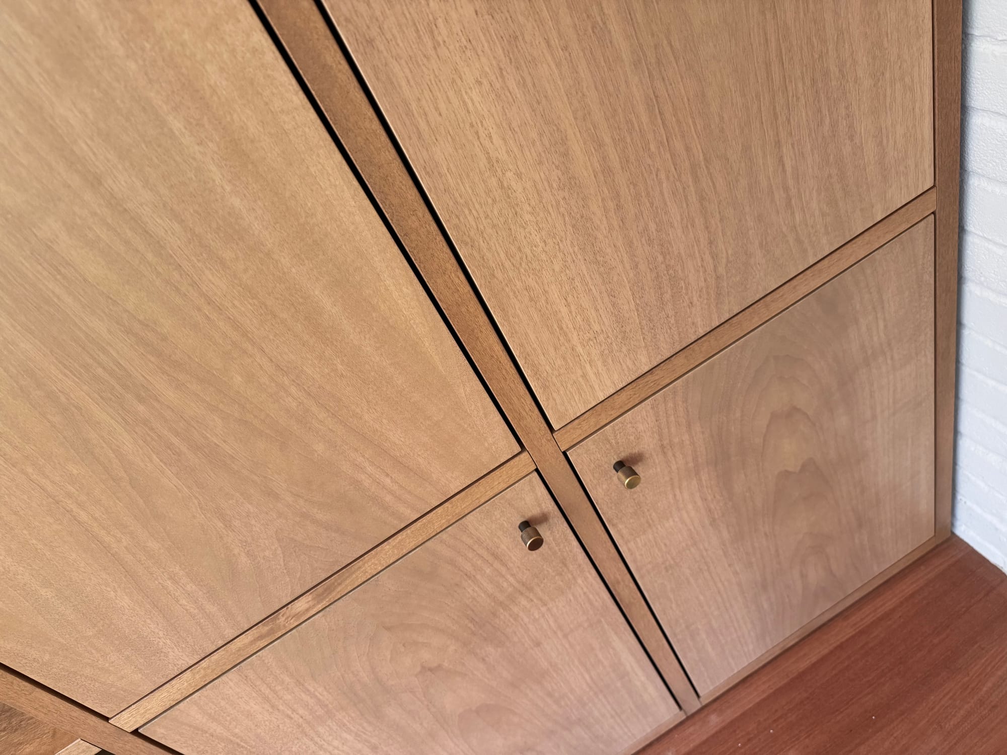 Per la struttura è stato scelto un listellare placcato Tanganika da 25 mm, un materiale che unisce stabilità, leggerezza e un disegno delle venature caldo ma discreto. Lo spessore importante dei ripiani dà solidità visiva e tecnica, permettendo campate ampie e linee pulite, senza la necessità di rinforzi invasivi. Il legno, con le sue tonalità morbide, dialoga con il pavimento e con gli oggetti che andranno a popolare i vari scomparti, creando una continuità visiva che attraversa tutta la stanza.