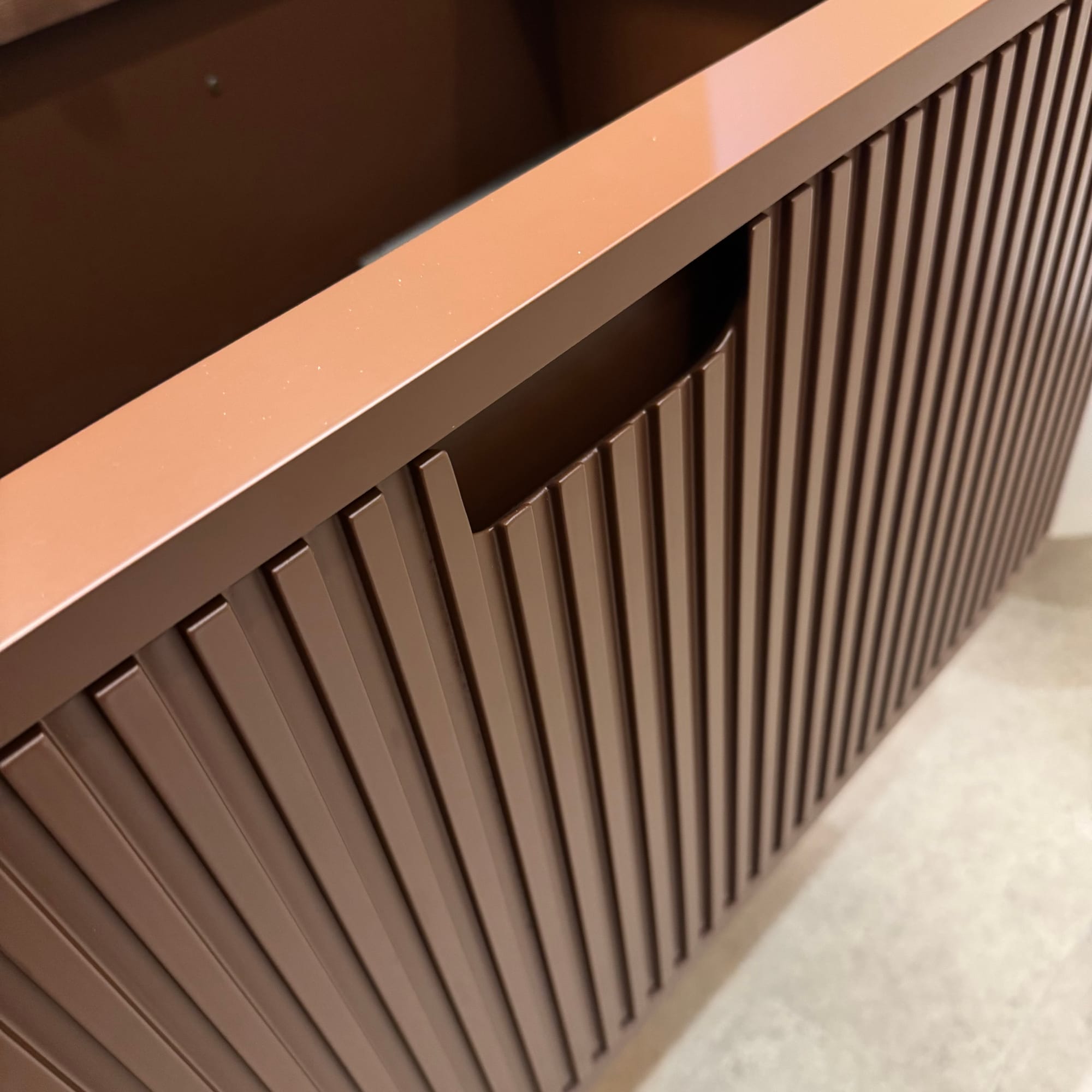 Esteticamente, il mobile è riconoscibile per la lavorazione cannettata del frontale e dei fianchi, realizzata al centro di lavoro (CNC) per ottenere un ritmo preciso e regolare. Le scanalature verticali movimentano la superficie, giocano con la luce e regalano profondità, trasformando un semplice cassetto in un elemento d’arredo importante. Ogni cannetta segue una linea perfetta, sottolineando l’attenzione al dettaglio tipica della lavorazione su misura.