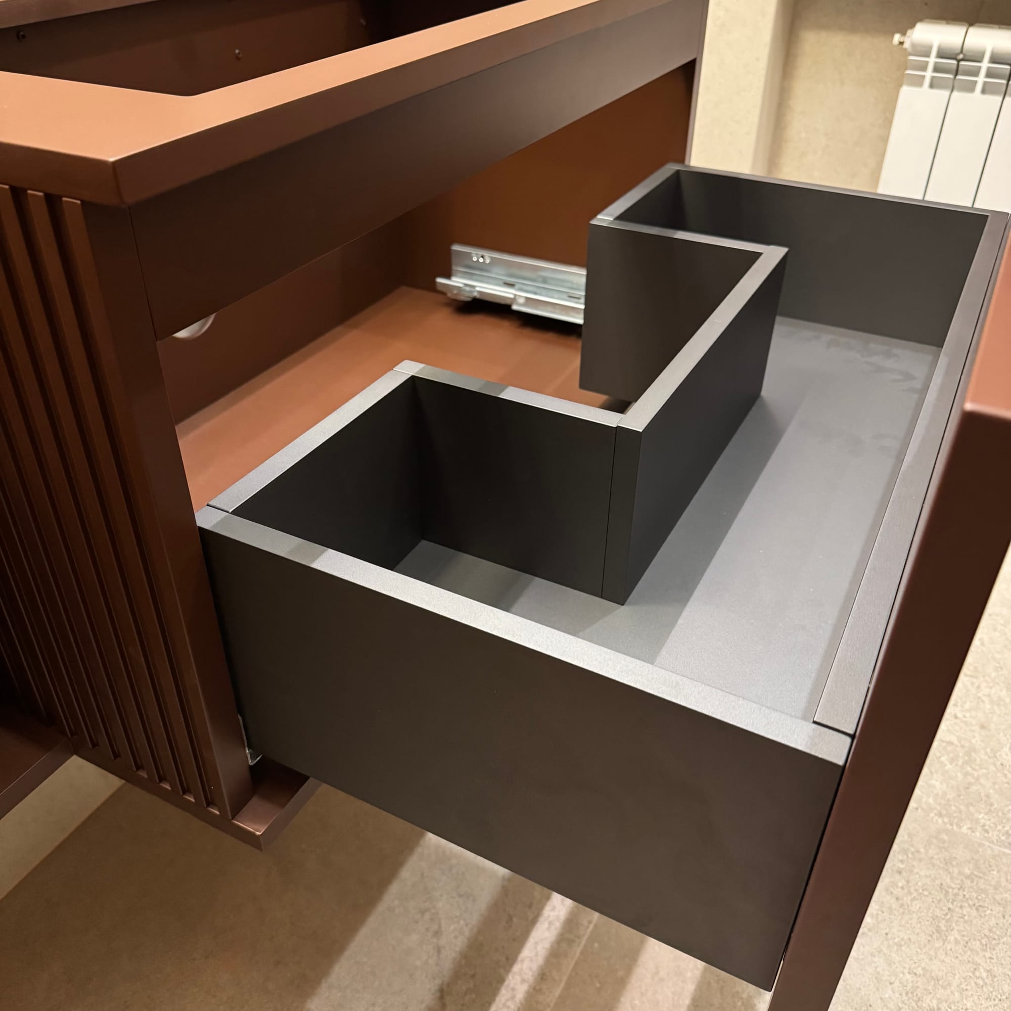 Il cuore del progetto è il grande cassetto frontale, anch’esso in MDF, laccato in antracite per creare un contrasto raffinato con la struttura. L’interno scorre morbido grazie alla ferramenta Blum, scelta per garantire affidabilità e fluidità nel tempo, anche con un uso quotidiano intenso. È quel tipo di dettaglio invisibile ma fondamentale, che fa la differenza nella percezione di qualità.