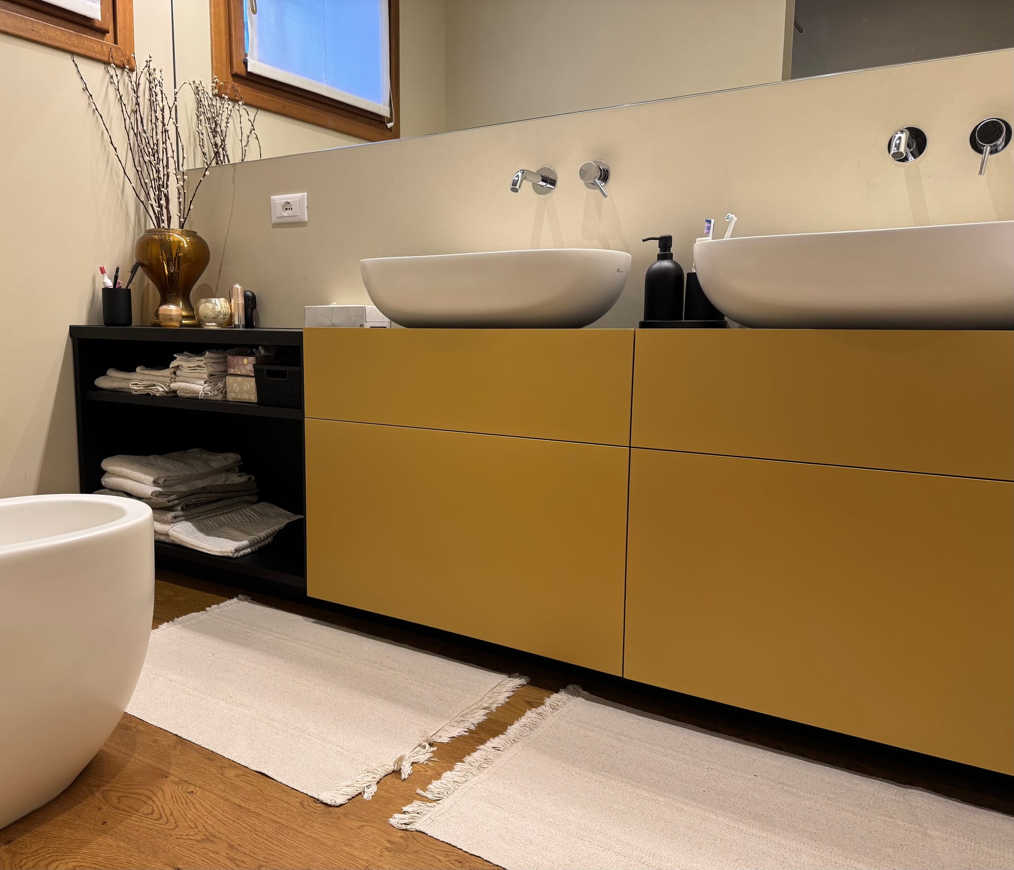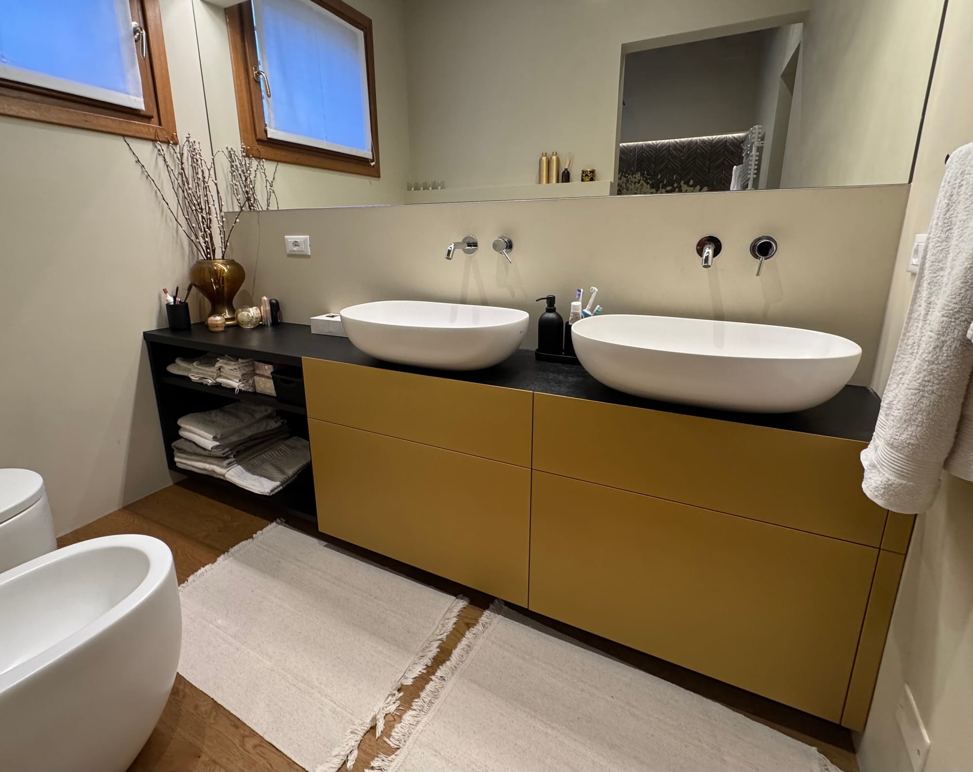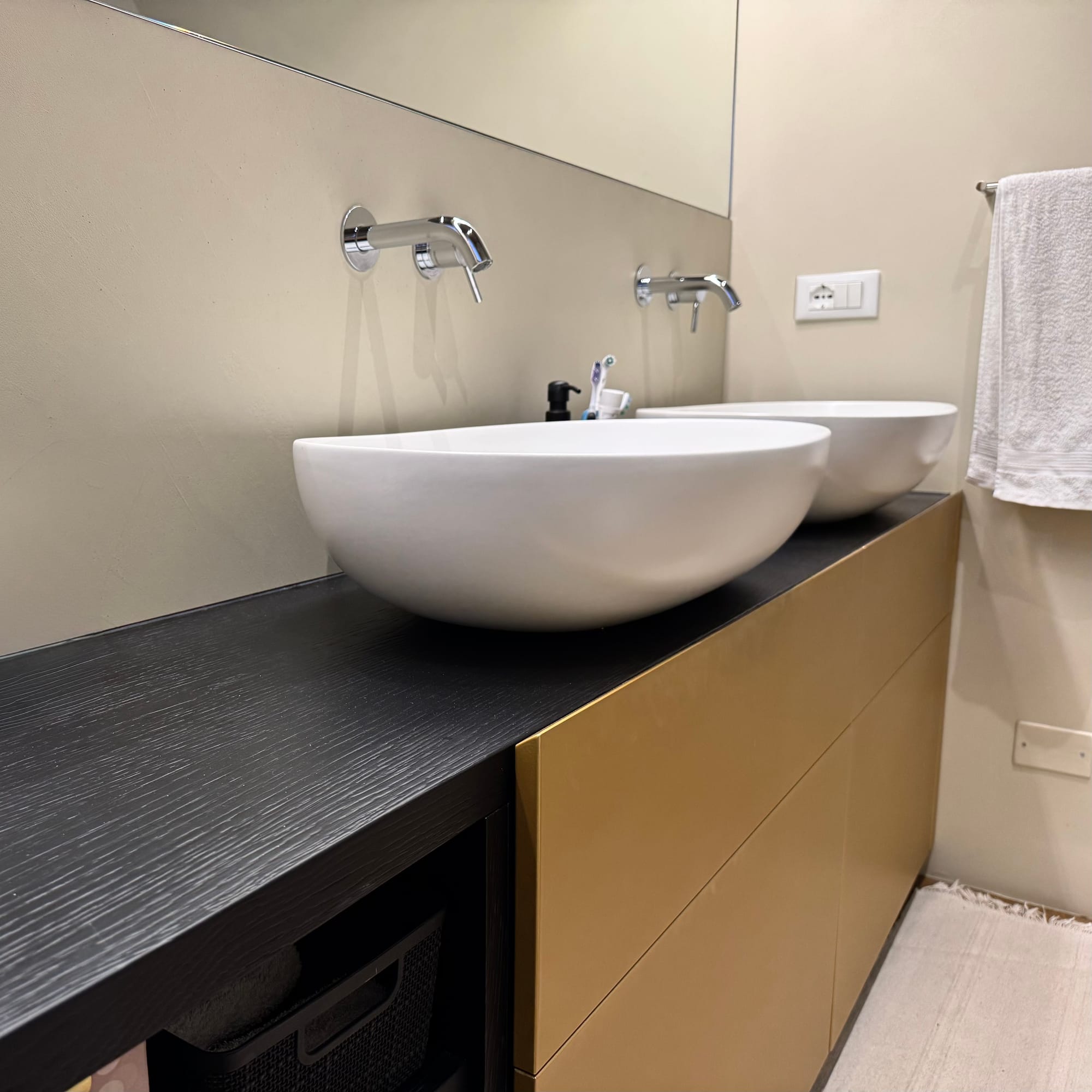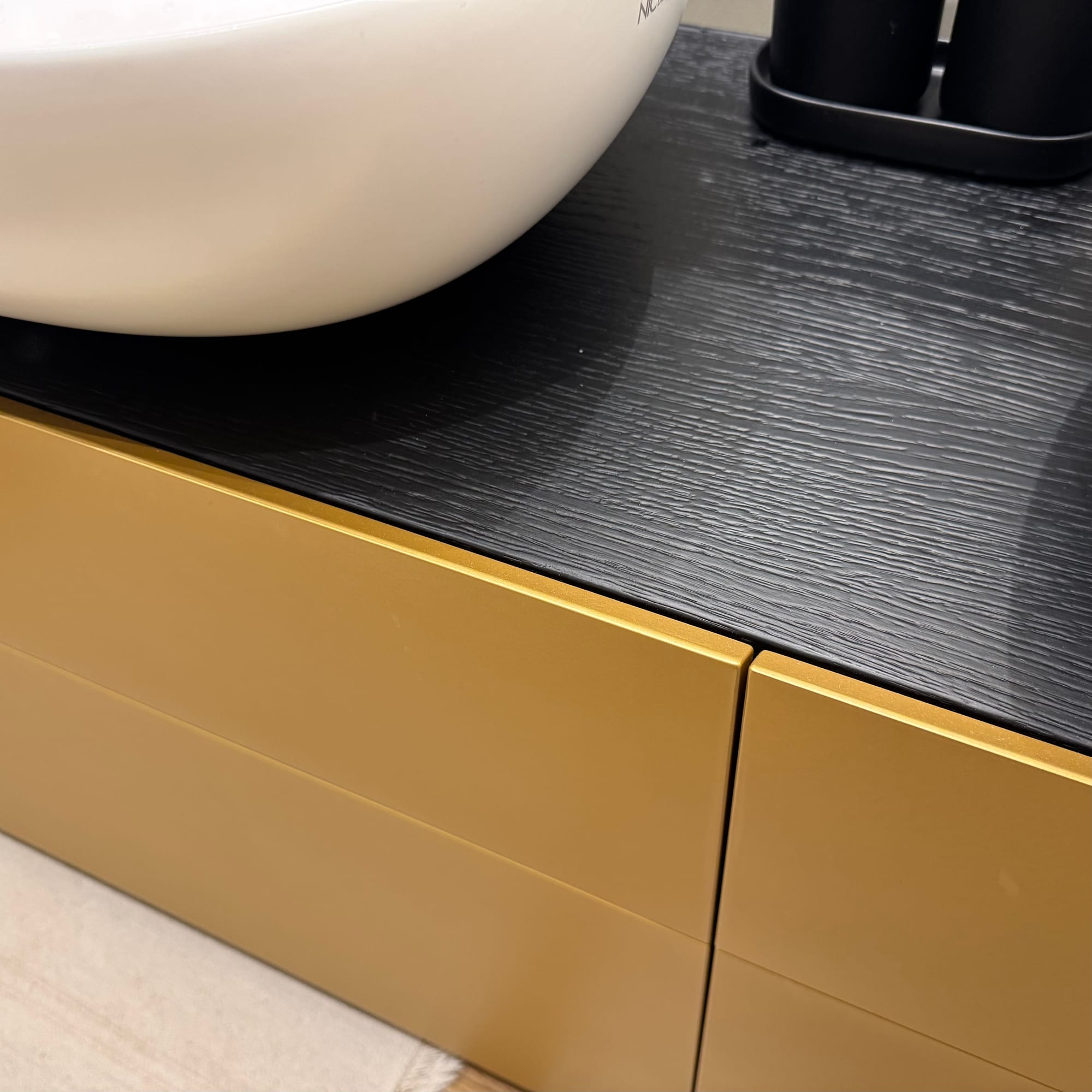 Un mobile da bagno in listelare biplacato rovere laccato nero, con frontali dei cassetti in MDF idrofugo laccati oro