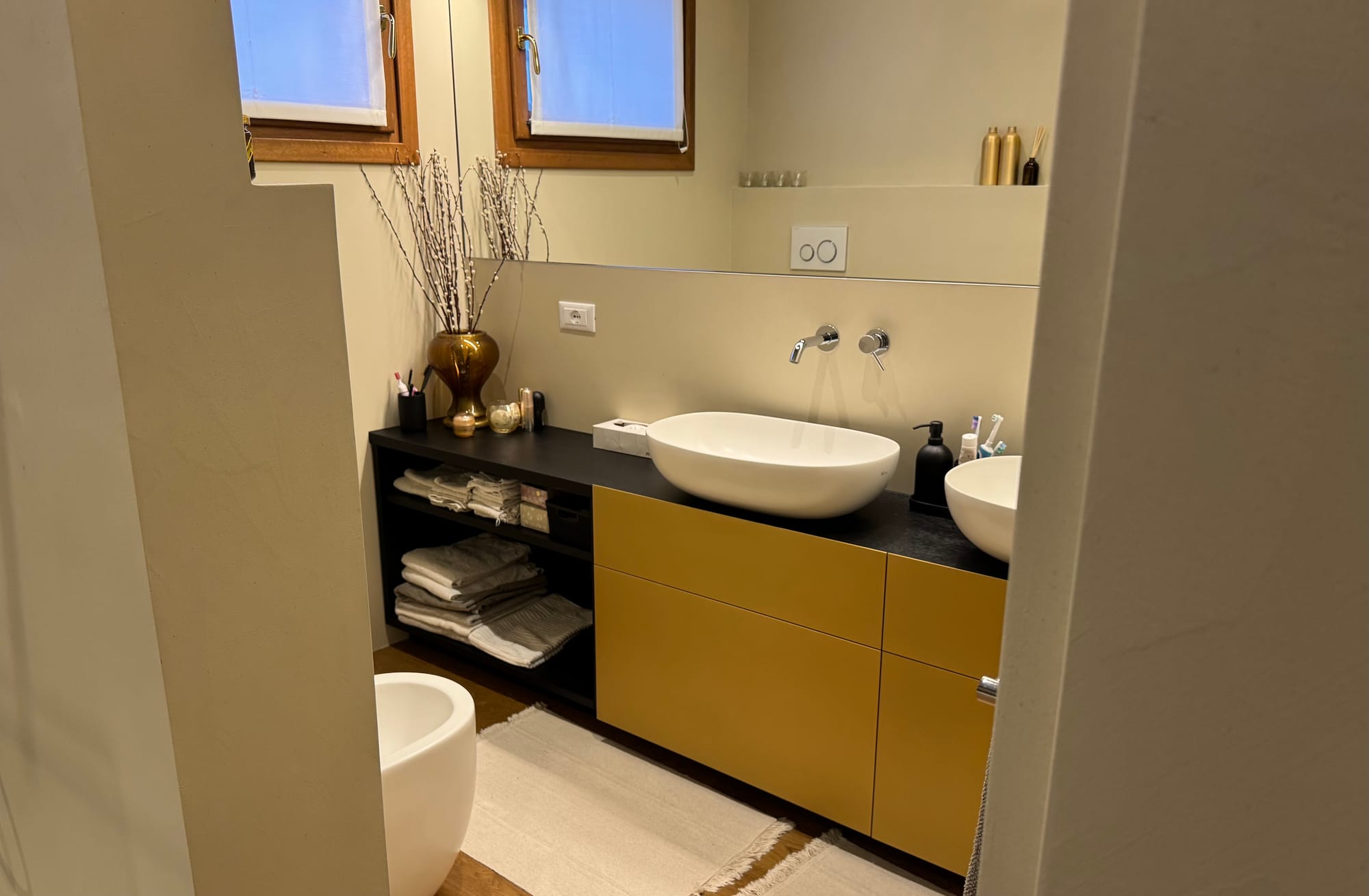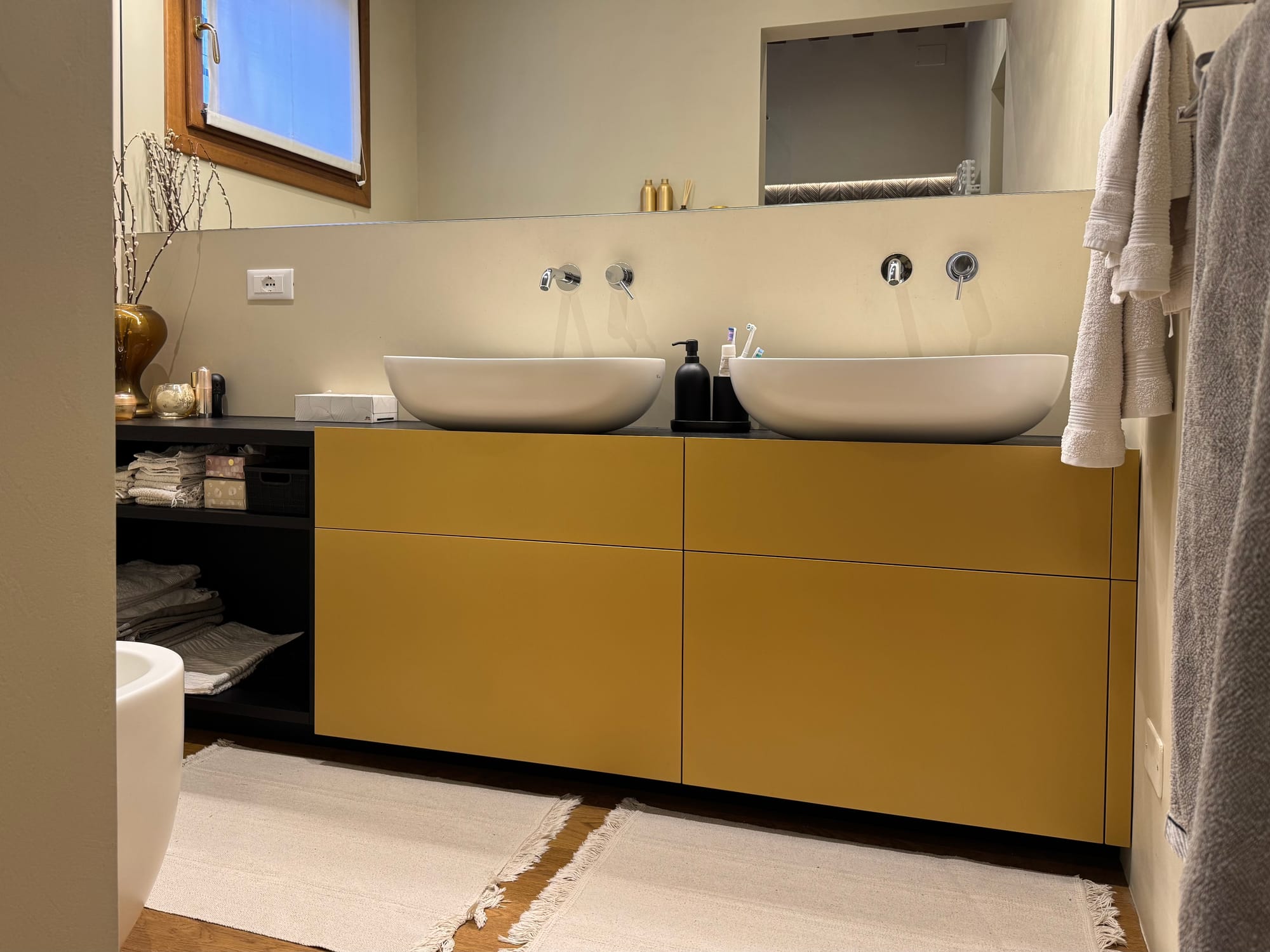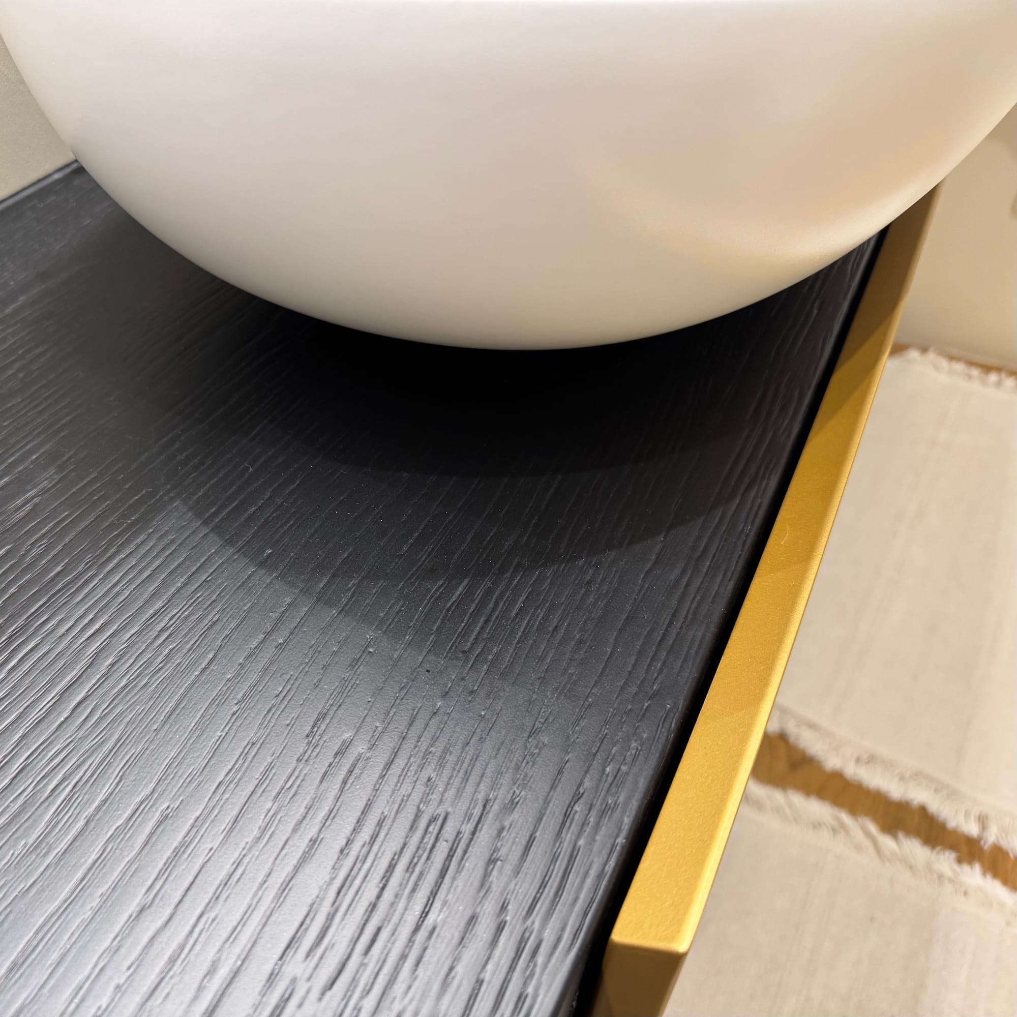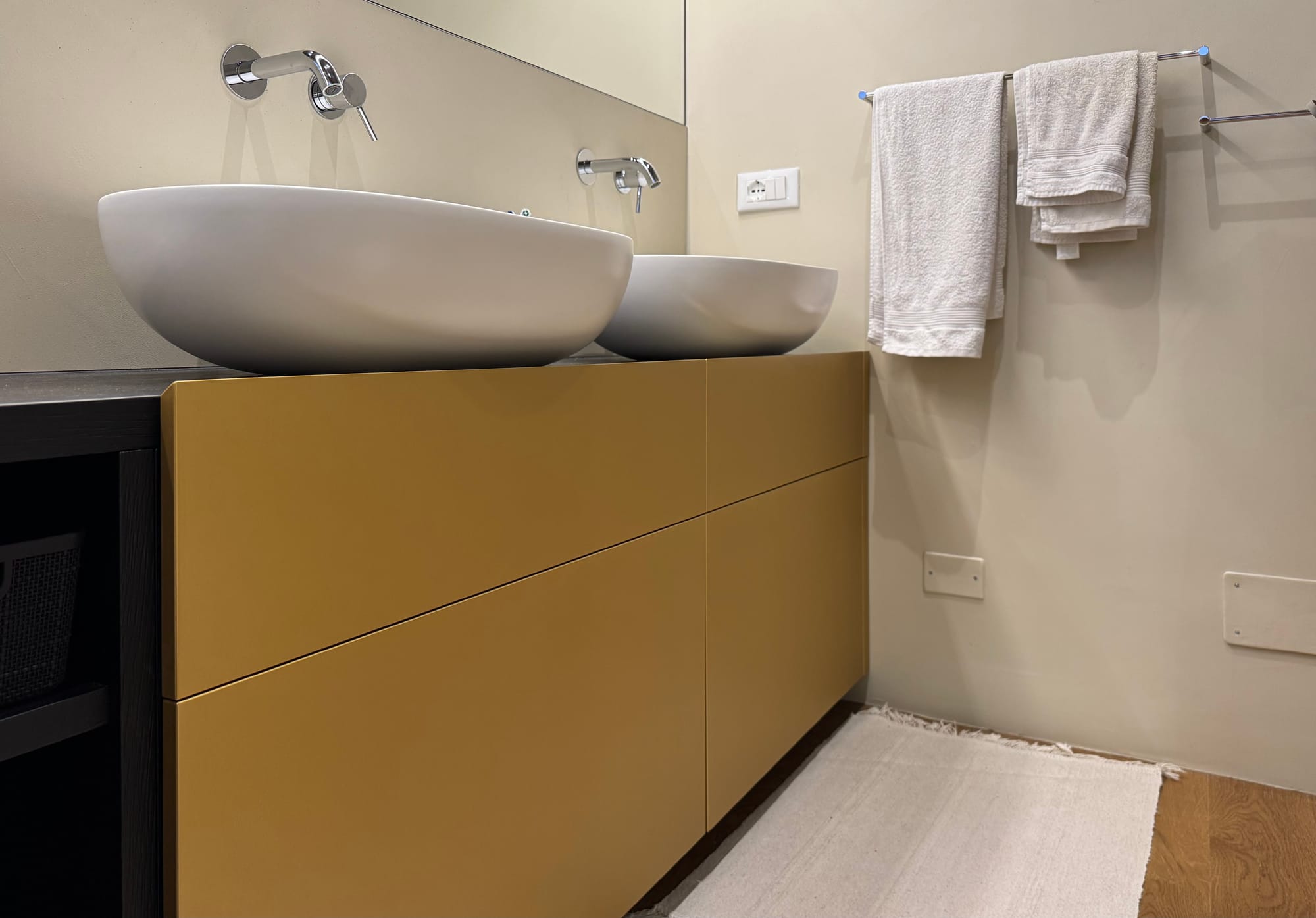 Un mobile da bagno in listelare biplacato rovere laccato nero, con frontali dei cassetti in MDF idrofugo laccati oro