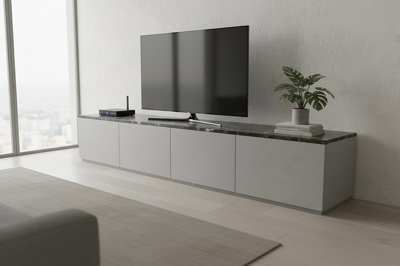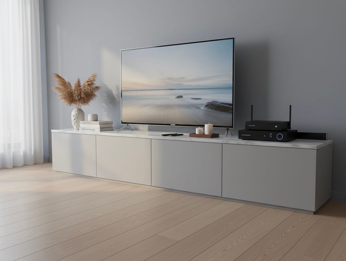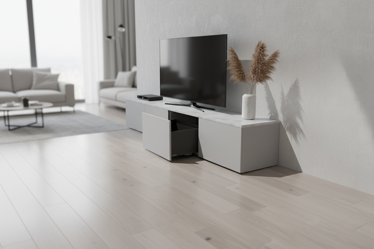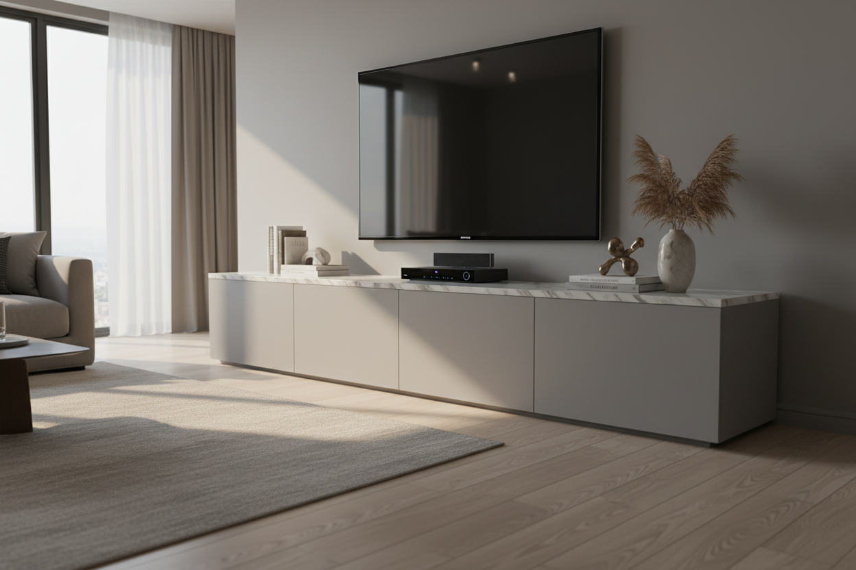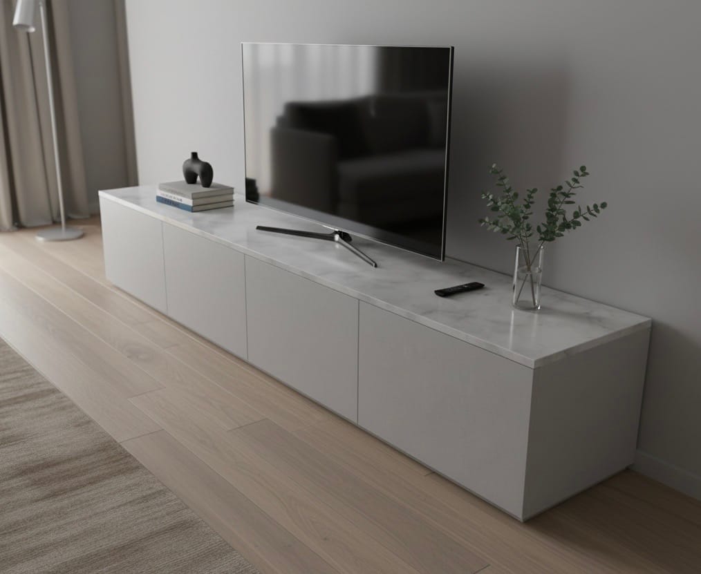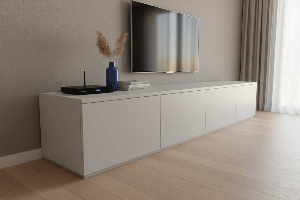 Una volta inserito in soggiorno, il mobile corre lungo la parete come un segno orizzontale pulito e continuo. La TV trova finalmente un appoggio proporzionato, gli oggetti decorativi possono alternarsi sul top – libri, vasi, piccole sculture – e lo sguardo non è più disturbato da cavi a vista e scatole improvvisate. È un arredo che migliora la qualità dello spazio giorno, rendendolo più ordinato, funzionale e piacevole da vivere.