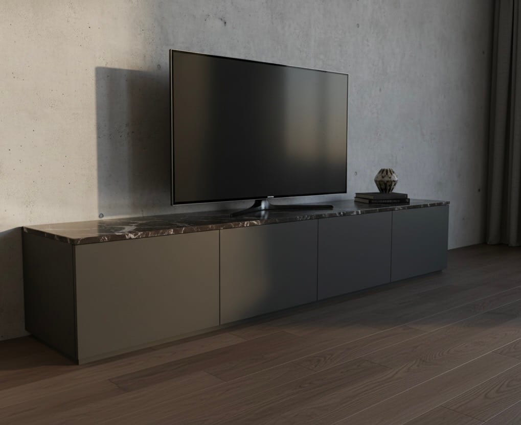 La base è composta da moduli affiancati, ognuno con misure precise: 60 cm di larghezza, 40 cm di altezza e 45 cm di profondità. Nel modello visibile in render sono stati scelti 4 moduli in sequenza, per una lunghezza totale di 240 cm: una dimensione perfetta per pareti di media e grande ampiezza, in cui il mobile diventa una vera “linea orizzontale” che disegna tutto il soggiorno.