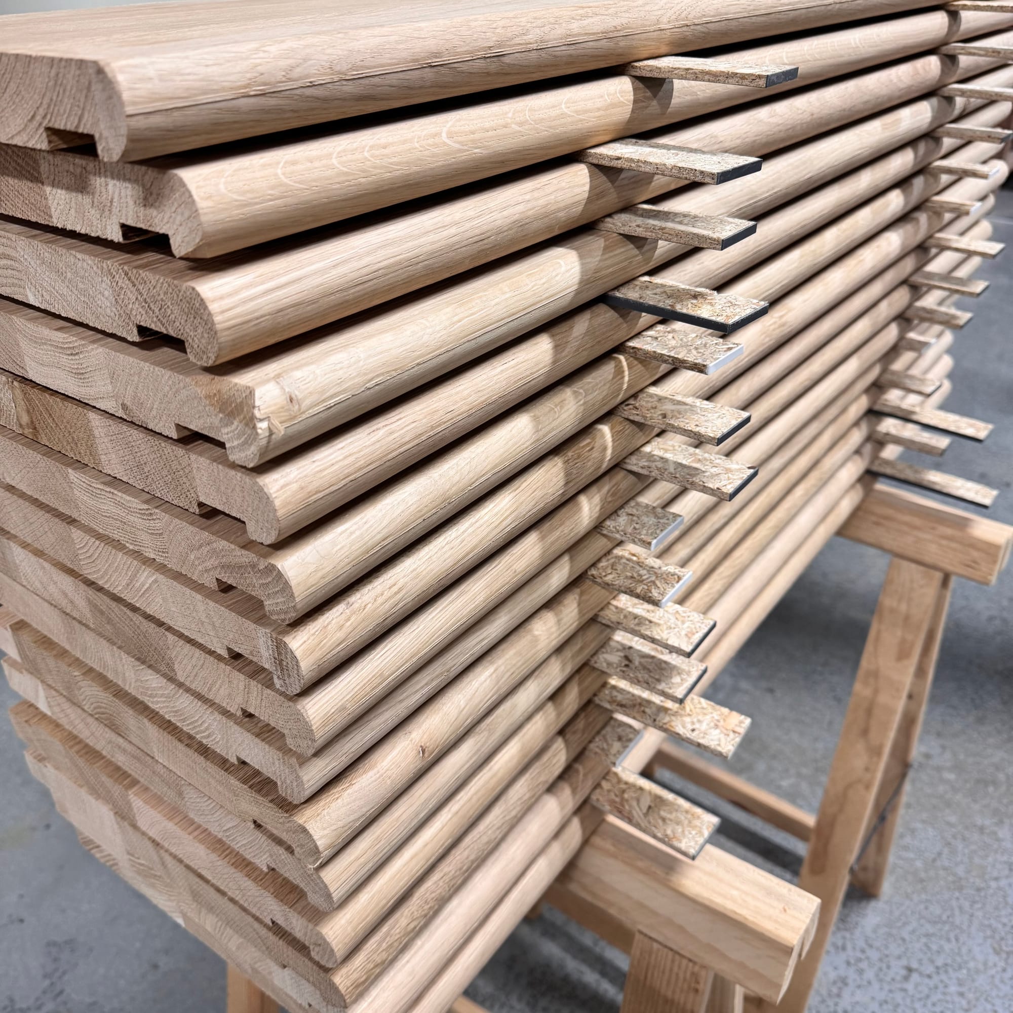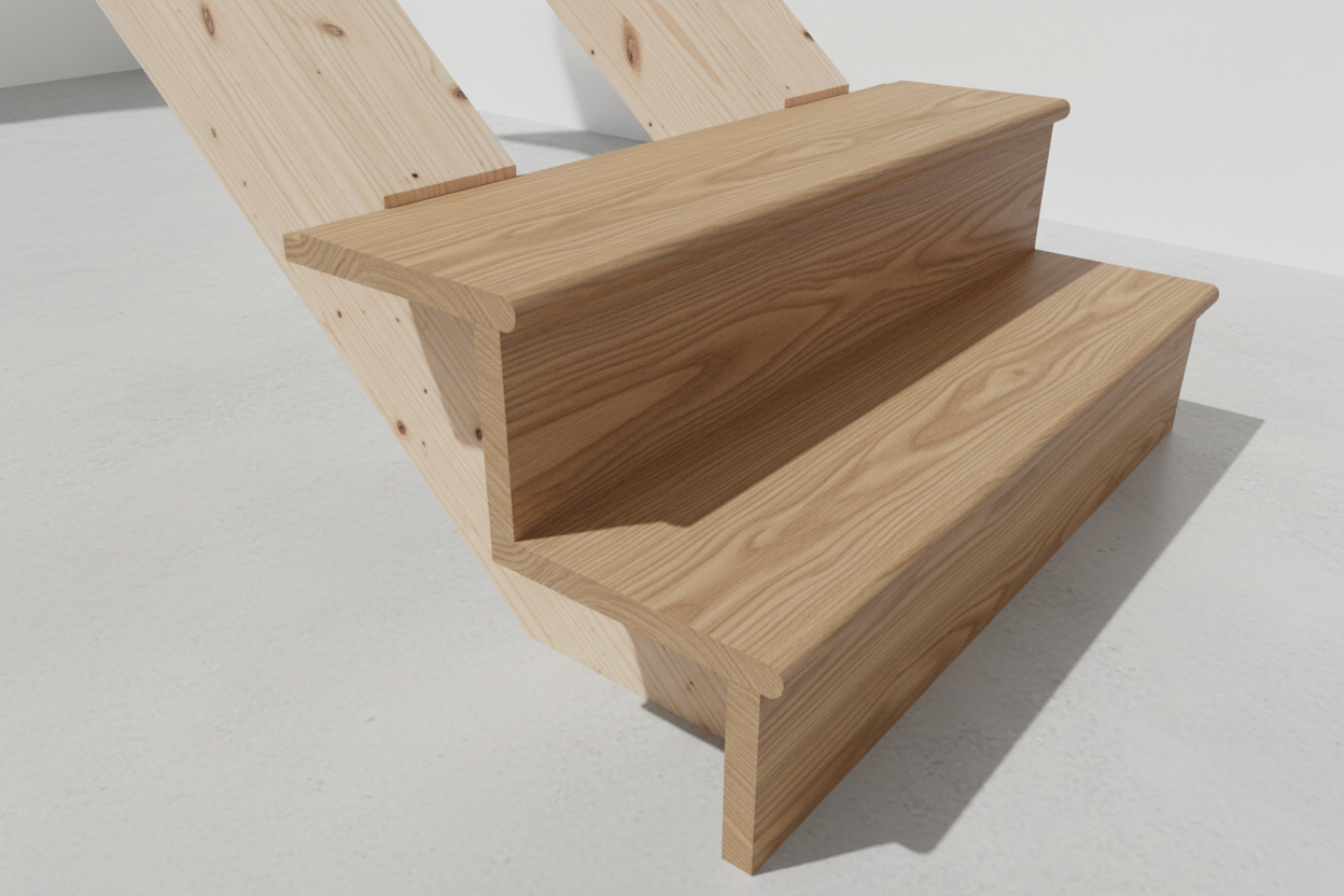 I longheroni sono in lamellare di abete, sezione 160×200 mm, scelti per garantire una buona rigidezza e una corretta distribuzione dei carichi. Pedate, alzate e pianerottolo sono in rovere lamellare da 27 mm, con un colore chiaro e una venatura regolare che si adatta bene agli interni veneziani. Stiamo curando con grande attenzione la finitura, utilizzando una vernice trasparente specifica per parquet, pensata per resistere all’uso quotidiano senza rinunciare al calore e al carattere del legno.