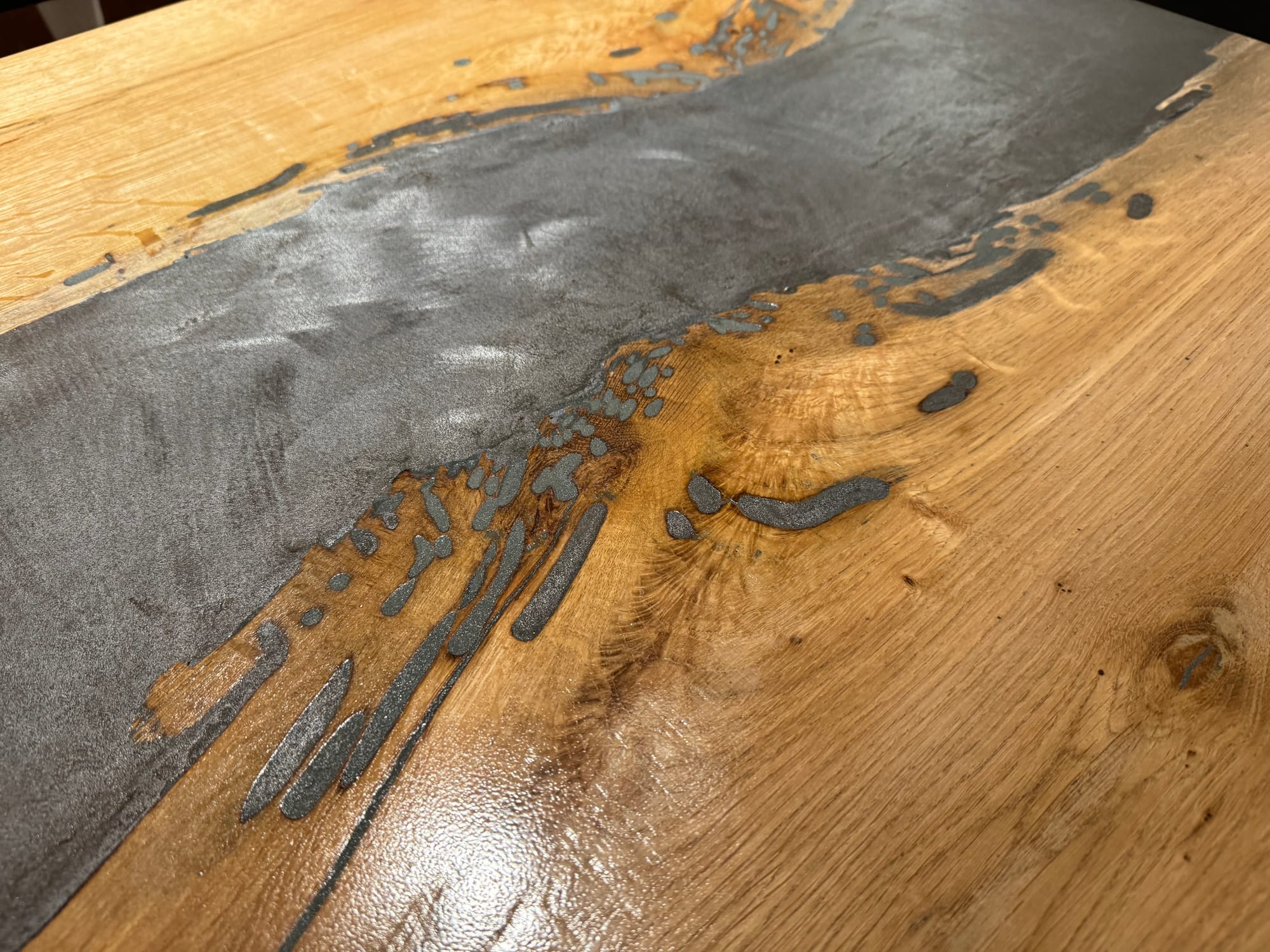 Sopra questa base si applica una placcatura costituita da cartelle di bricola veneziana dello spessore di 4 mm, caratterizzate da fori naturali causati dalle teredini, piccoli molluschi marini che lasciano sul legno tracce uniche. Questi fori vengono riempiti con la “Resina acrilica con polvere di ferro”, un materiale ecocompatibile che dona al tavolo un aspetto elegante e moderno, ispirandosi al celebre effetto river table ma con un’attenzione particolare alla sostenibilità.