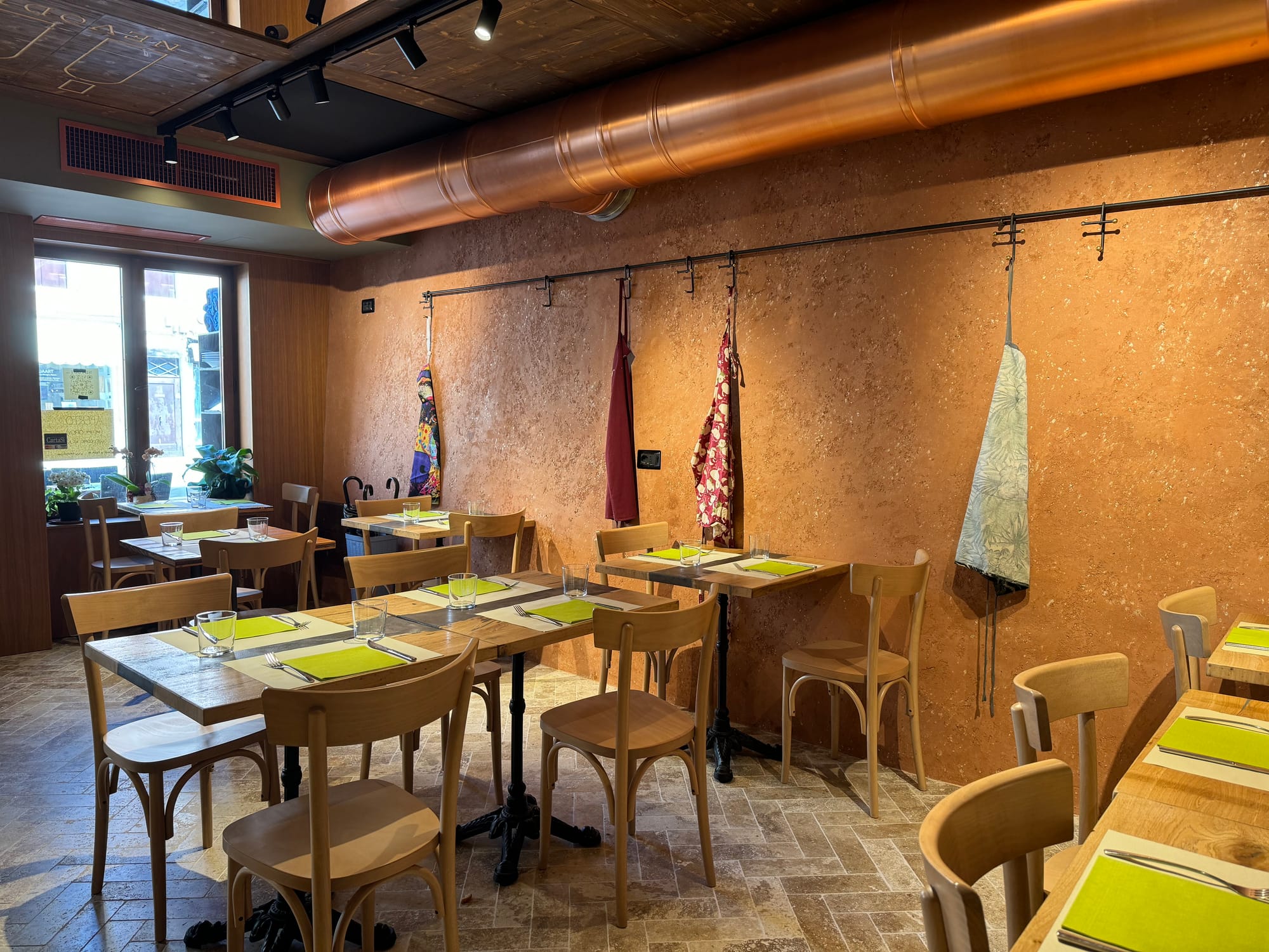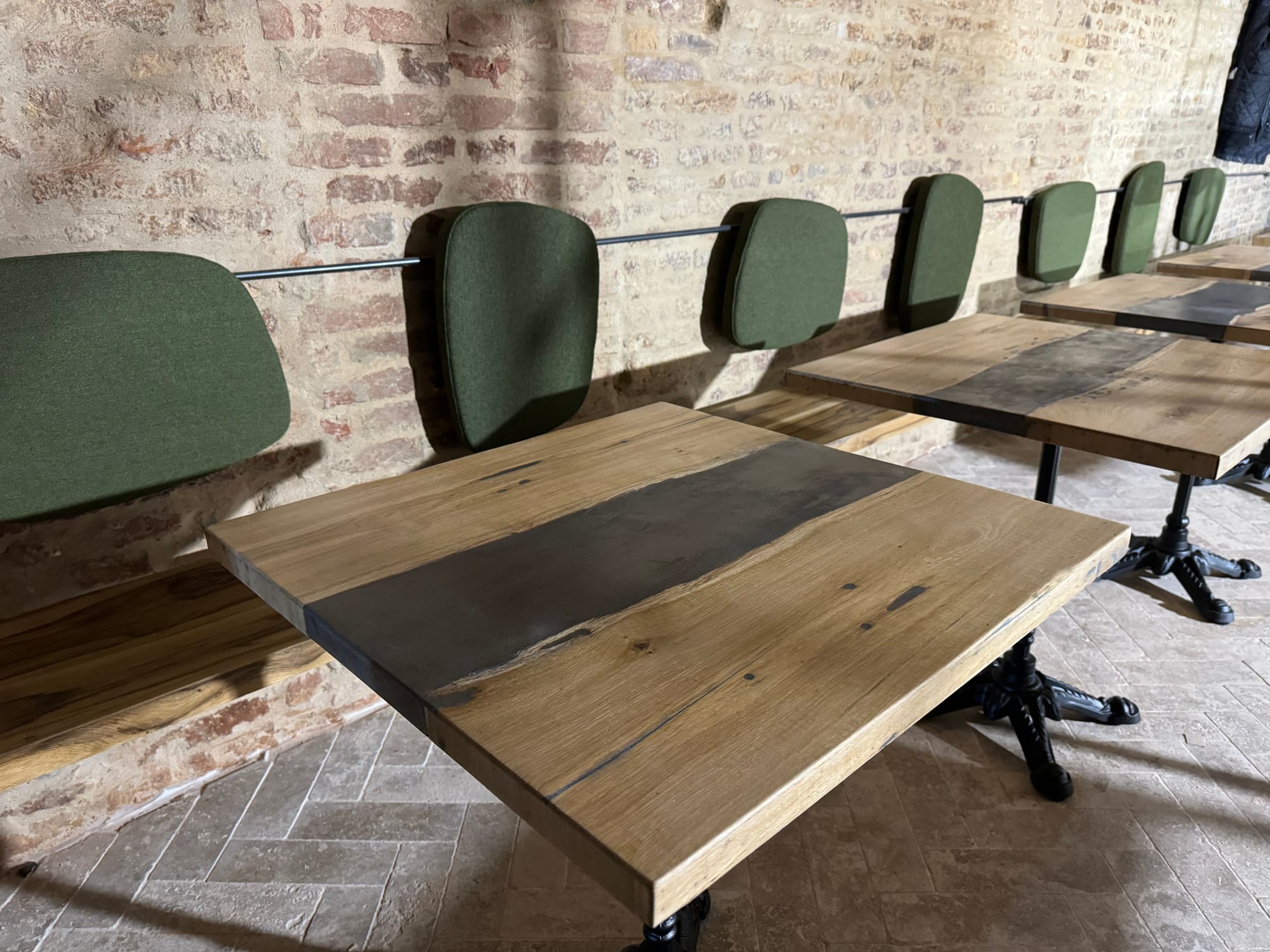 Il piano ha uno spessore totale di 35 mm e misura standard 70 x 70 cm, dimensioni ideali per i tavoli di ristoranti, che richiedono superfici compatte ma resistenti, perfette per il servizio e l’esperienza del cliente. La finitura è trasparente opaca, antigraffio, studiata per resistere all’usura quotidiana e garantire la protezione del legno senza alterarne la naturalezza e la bellezza della bricola.